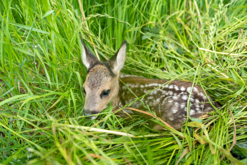 Im Mai und Juni werden die meisten Rehkitze geboren. In den ersten zwei Lebenswochen haben sie keinen Fluchtinstinkt und ducken sich bei Gefahr regungslos ins hohe Gras. Das ist für die kleine Tiere eine wichtige Überlebensstrategie.